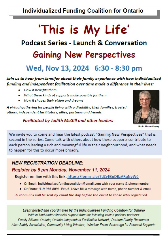 This virtual event gives participants from across Ontario the opportunity to hear our NEWEST podcast! Come join us as David’s mother, Jennifer, speaks candidly during the ‘This is My Life’ podcast – our second in the series. Jennifer shares how having individualized funding and being accompanied by an independent facilitator has contributed toward everyone in their family “gaining new perspectives”. She shares what it means to build a meaningful life and discover what it takes to work, day by day, on making it happen.
